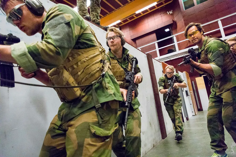 Stian Saugestad og Aleksander Aamodt Kilde leder an for å klarere øvingsbygget under antiterrortrening hos Forsvarets Spesialkommando i Rena Leir. Henrik Kristoffersen (bakerst), Sebastian Foss Solevåg (t.h) og Leif Kristian Nestvold-Haugen følger på. Foto: Gunnar Lier