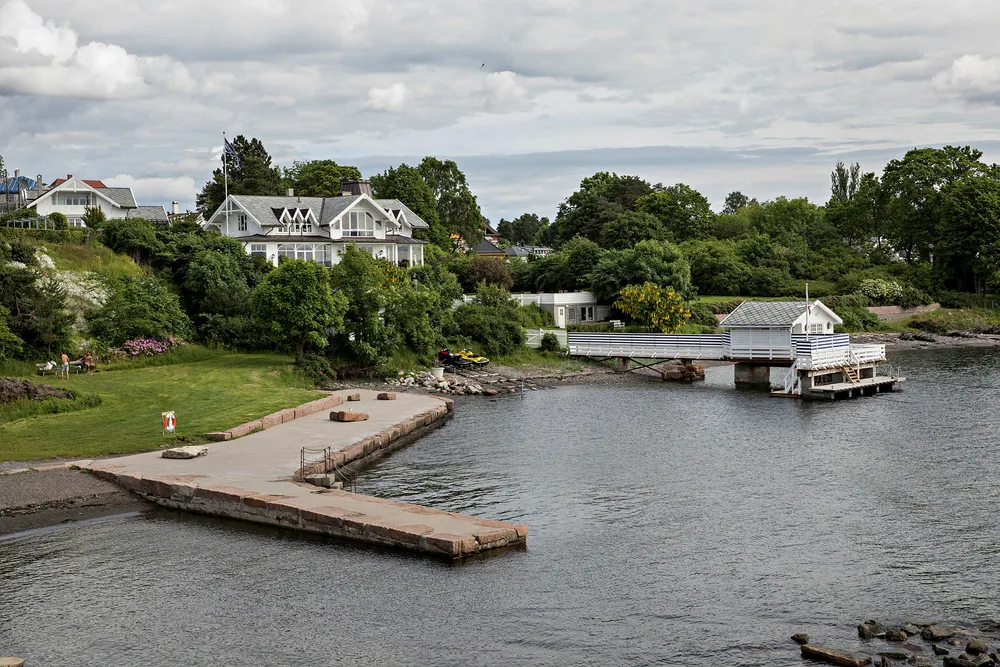Christian Ringnes har satt opp flere kryss under gangbroen til badehuset på eiendommen ved siden av Huk-stranden. I tillegg har han satt opp en port på gangbroens landsside. Begge deler hindrer ferdsel og er ulovlig, ifølge Bymiljøetaten. I tillegg skal kommunen vurdere om vindskjermer på gangbro, steinskille og vannscooter-slippen er i strid med lovgivningen for strandsonen Eiendommen i Schiøtts vei 6A er nabo til stranden Stoltenberg-regjeringen kjøpte i 2005 etter avdøde Svein Erik Bakke. Den nær 100 meter lange stranden ble skilt ut og gjort til en forlengelse av friarealet på den populære Huk-stranden. Foto: Aleksander Nordahl
