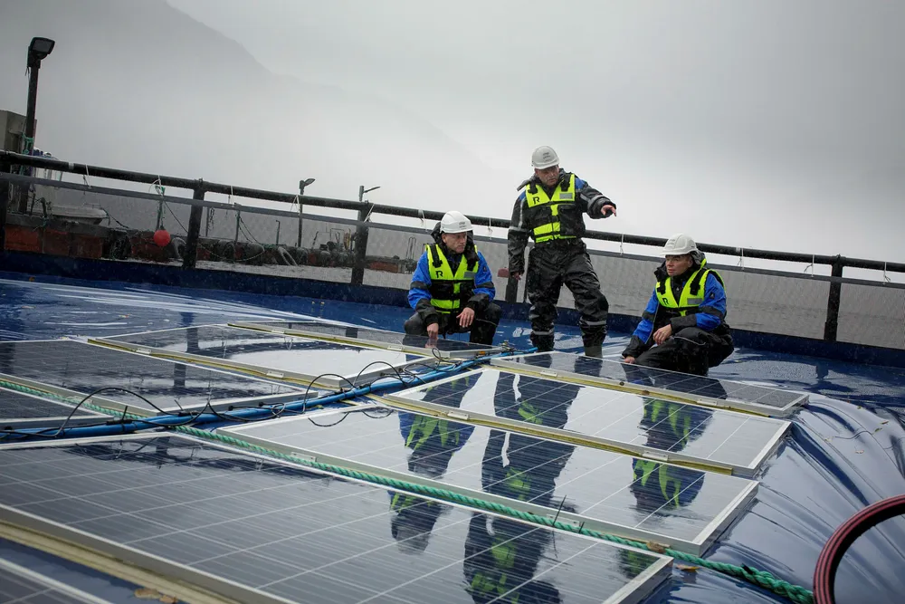 Ocean Sun-gründerne Øyvind Christian Rohn (sittende) og Børge Bjørneklett (til høyre) viser frem solcellepanelene for Bjørn Thorud (til venstre) i Multiconsult. I bakgrunnen snakker Arnt Emil Ingulstad (til venstre) fra Ocean Sun med Stanislas Merlet fra Multiconsult. Foto: Eivind Senneset