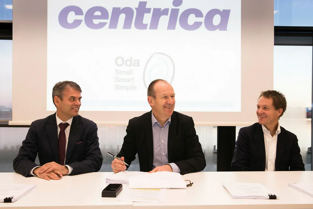 Deler ut milliardkontrakter i NordsjøenNorske oljeserviceselskaper hanker inn over to milliarder på nyskapende samarbeid.EnergiF.v. FMC-sjef Rune Thoresen, Centrica-sjef Dag Omre og Subsea 7-sjef Stian Sande signerer milliardkontraktene i Stavanger torsdag. Foto: Morten BerentsenFredrick Chr. Ekeseth