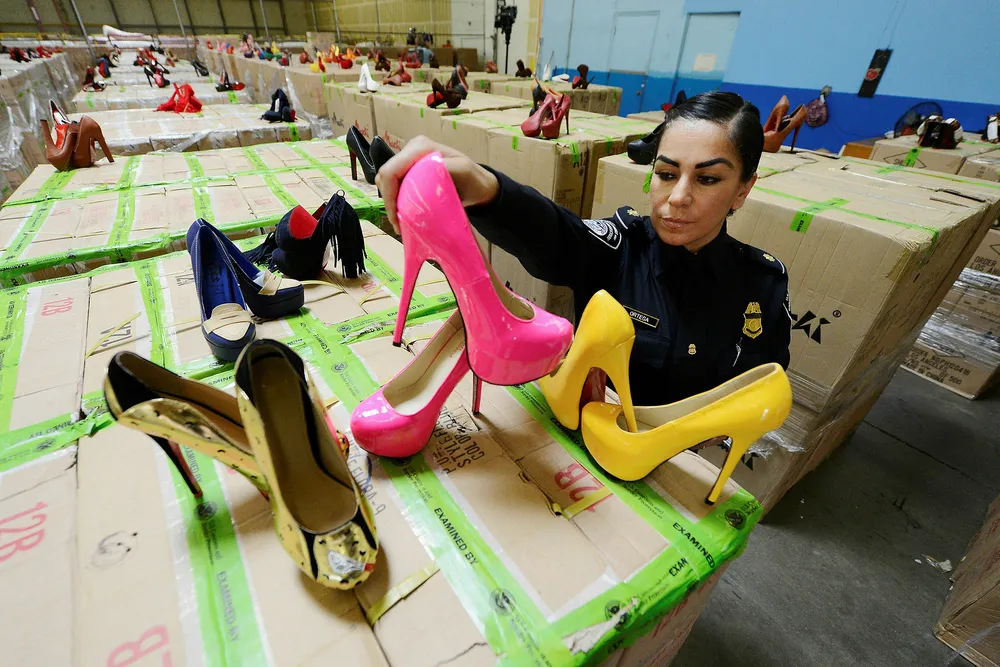 Høye grenseavgifter krever langt flere tollere. Her har en toller ved havnen i Long Beach i California beslaglagt falske Christian Louboutin-sko fra Kina. Foto: Kevork Djansezian/Getty Images