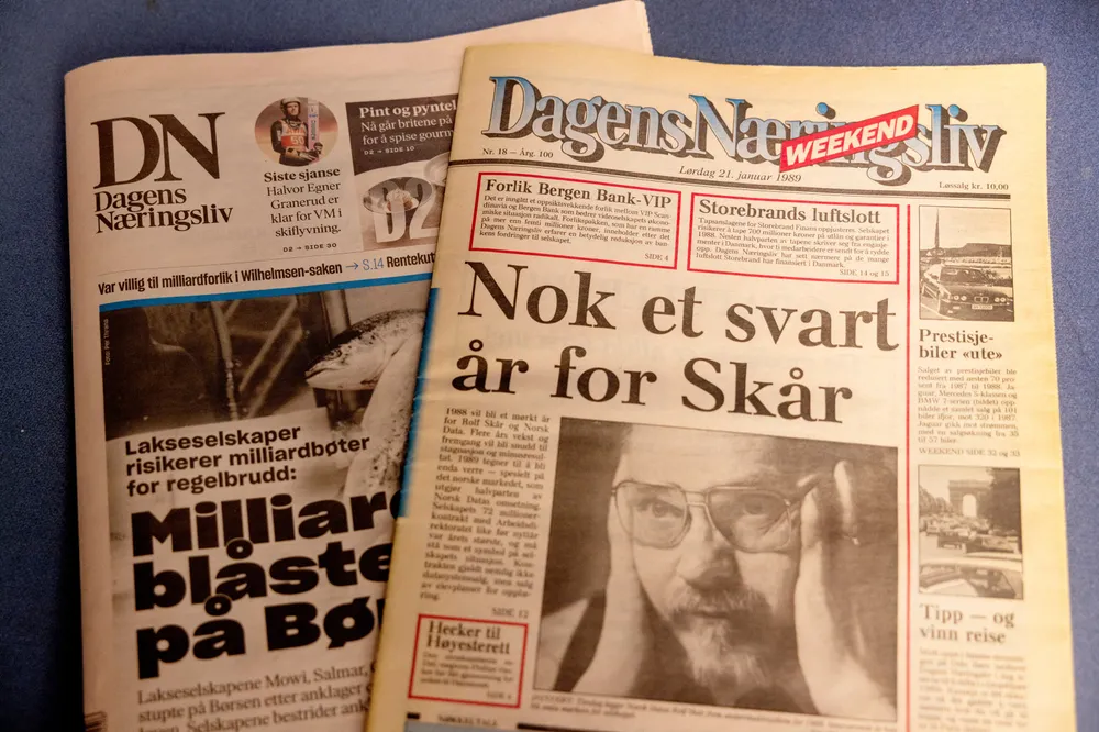 Hvite dager i Dagens NæringslivLederDen første utgaven av DN på rosa papir kom i 1989. Fredagens utgave var den siste rosa. Heretter trykkes DN på hvitt papir både hverdager og lørdager.Foto: Mikaela BergDN leder