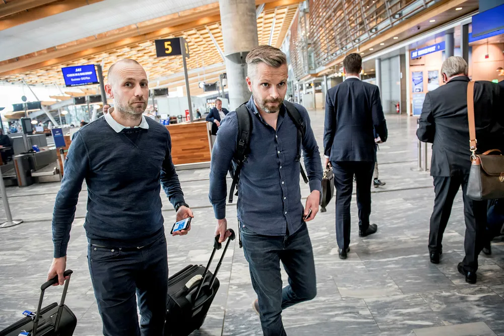Ole Dag Løvehaug (til venstre) og kollega Anders Engøy i helseteknologiselskapet Karl Storz flyr ofte med SAS: – Vi er spente på hva som skjer neste uke, for da har flere kolleger bestilt reise til Chicago. Men jeg tror SAS er fleksibel, om det blir streik, sier Engøy. Han har rundt 50 reiser med SAS årlig.
