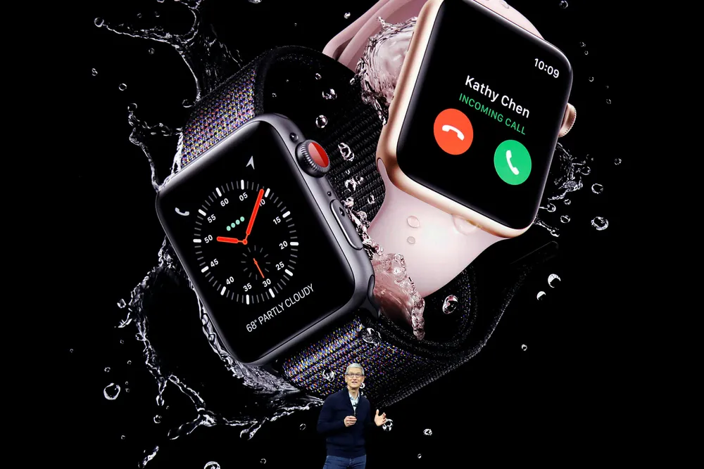 Investorer som begynner å få høydeskrekk gjør med andre ord lurt i å se forbi overskriftene og heller ta en titt på tallene, Apples for eksempel. Her presenterer Apple-sjef Tim Cook nye Apple Watch i Steve Jobs Theater 12. september. Foto: Marcio Jose Sanchez/AP/NTB Scanpix