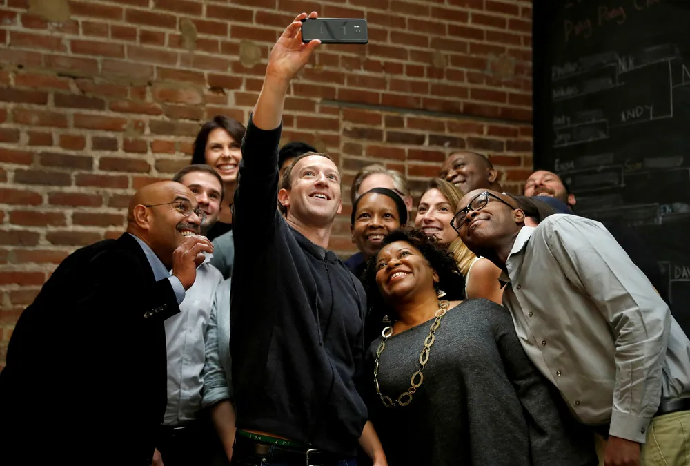 Oppgangen i verdens aksjemarkeder hittil i år har vært unormalt skjevt fordelt på tvers av sektorer. Her Facebook-gründer Mark Zuckerberg sammen med en gruppe innovatører. Foto: Jeff Roberson/AP/NTB Scanpix