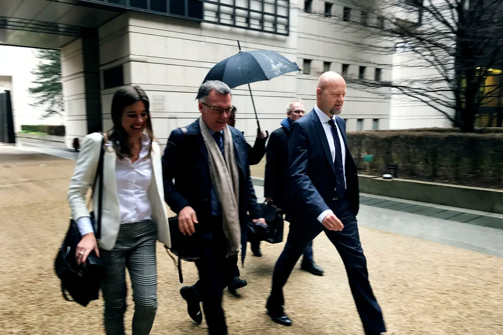 Her er Oljefondssjef Yngve Slyngstad (til høyre) på vei inn i det franske økonomidepartementet i Paris mandag ettermiddag for å snakke om klimarisiko for investorer. Tirsdag deltar han på klimatoppmøte i byen sammen med statsminister Erna Solberg. I midten er ministerråd Henrik Harboe ved den norske ambassaden i Paris. Til venstre er presseansvarlig Marthe Skaar i Oljefondet. Foto: Kjetil B. Alstadheim
