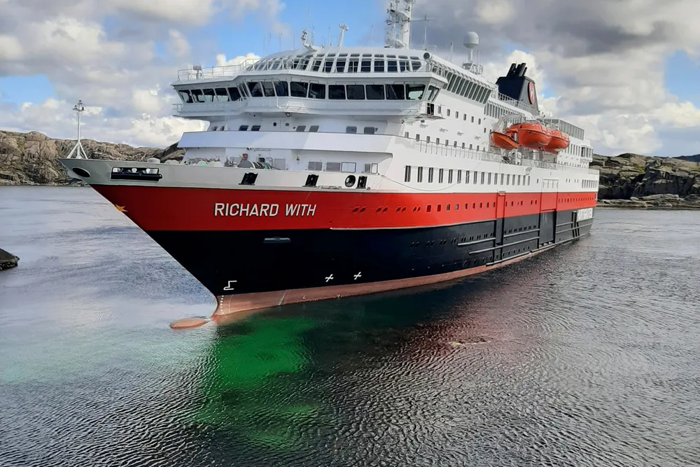 Hurtigruteskipet MS Richard With gikk på grunn i Solund kommune ved utløpet av Sognefjorden fredag. Nå fraktes skipet til et skipsverft for å utbedre skadene.
