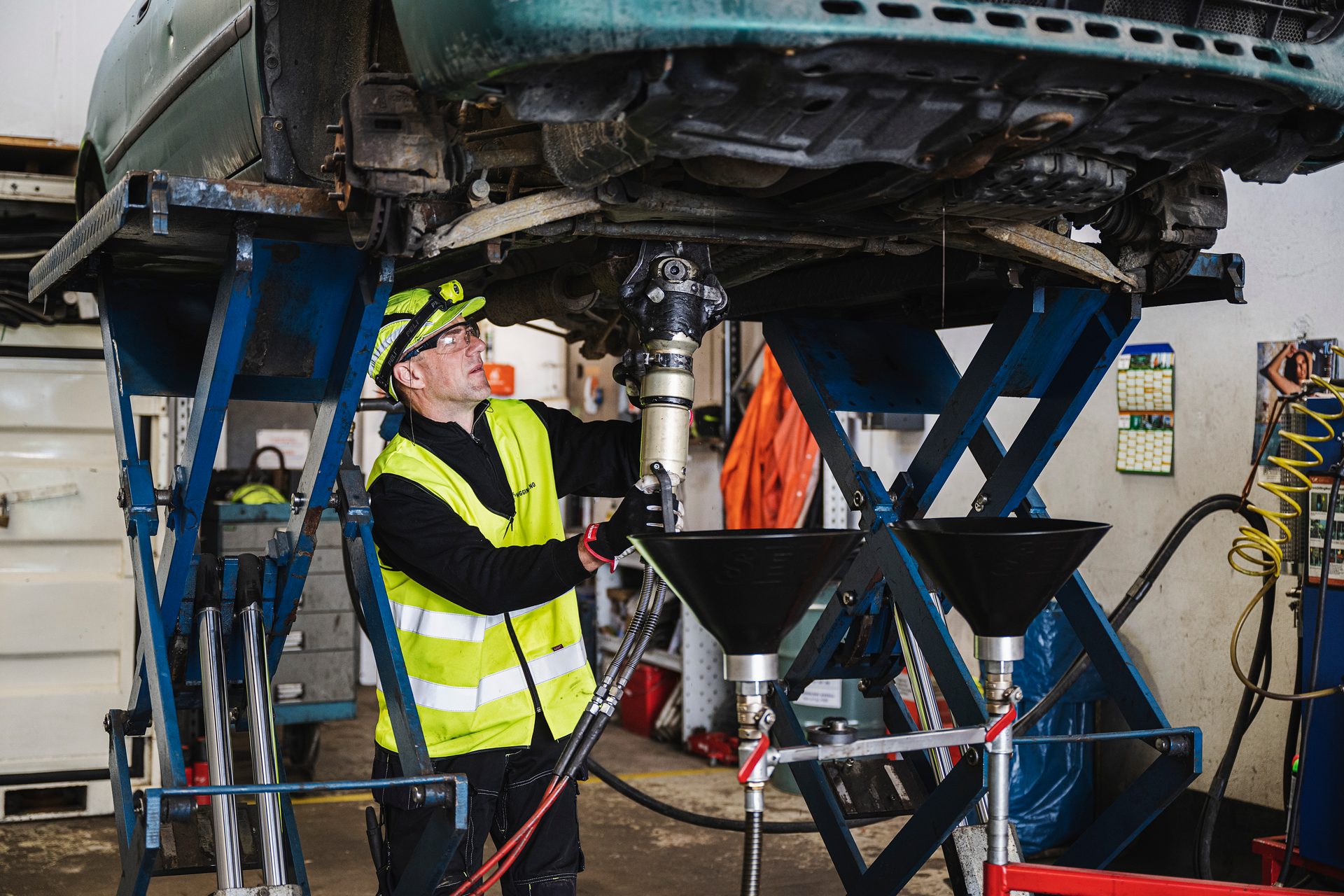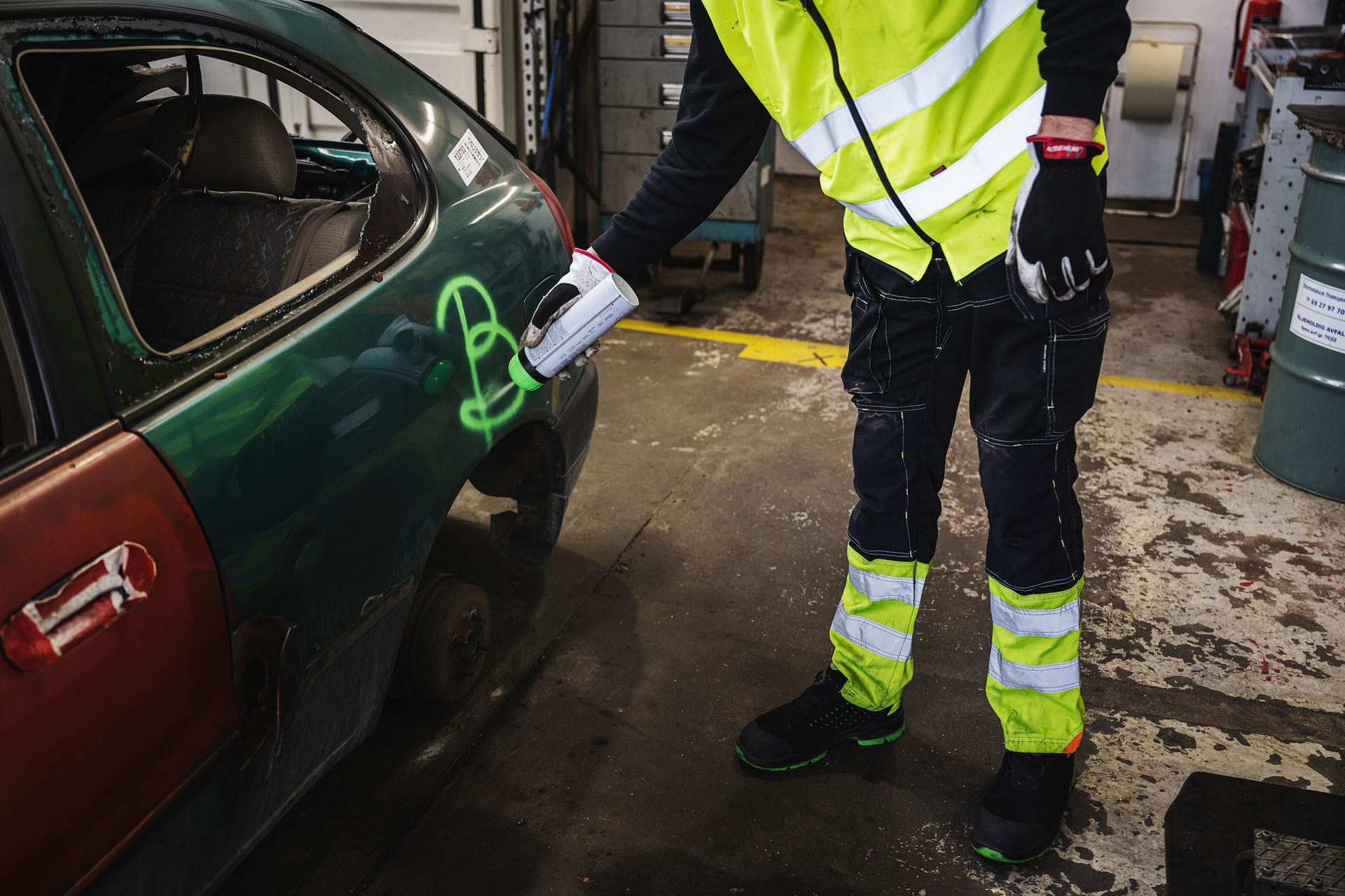 1. Først skrus dekk og felger av, deretter saneres bilene ved at miljøskadelige komponenter som olje, drivstoff og andre væsker tappes ut, mens batteriet, oljefilter og katalysator fjernes.