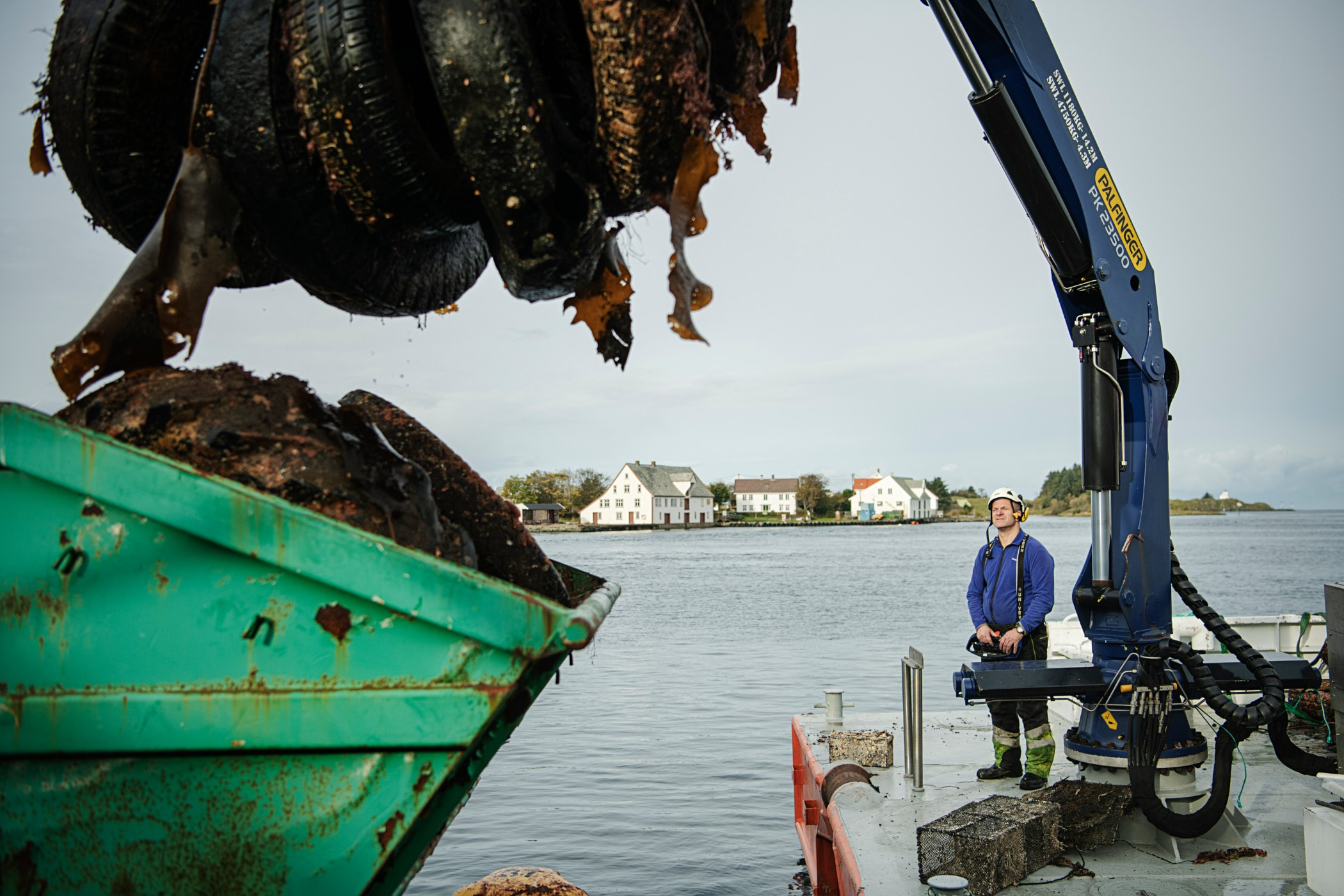 – Vi har containere, biler og et etablert system for avfallshåndtering og gjenvinning, sier Margret, mens hun hoderystende ser at nok en klynge med dekk fiskes opp av saltvannet.