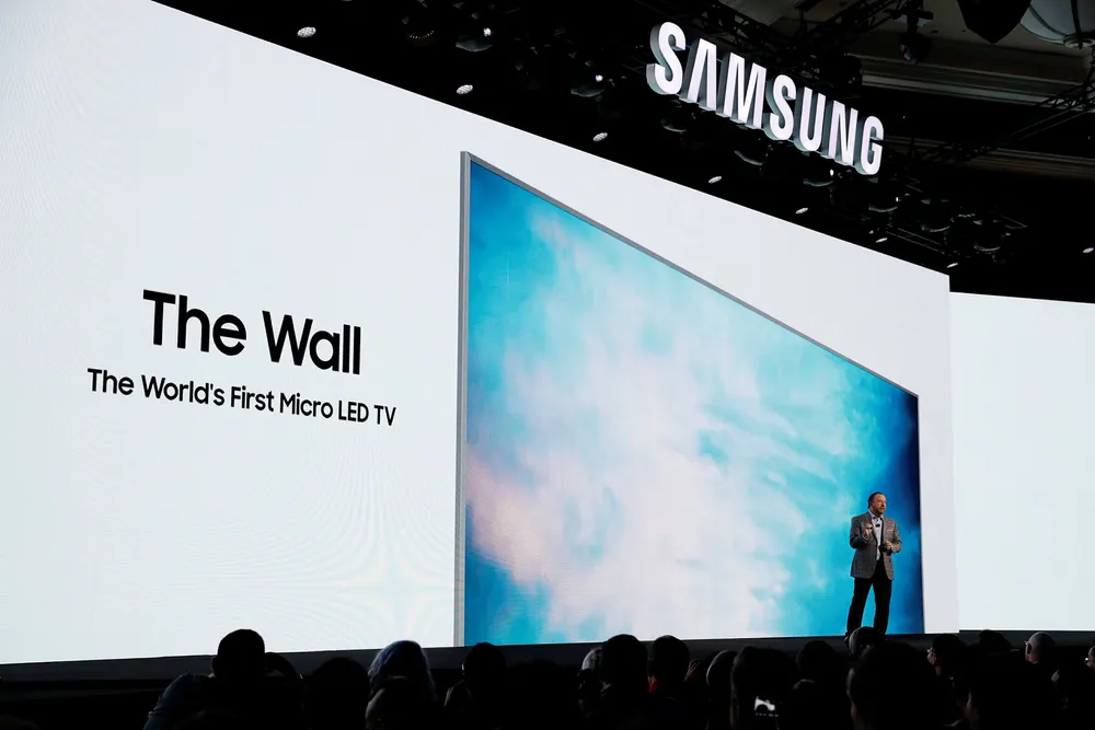 Denne tv-en kan du bestemme størrelsen på selvMed Samsung «The Wall» kan du bygge en storskjerm i stuen din.TeknologiJoseph Stinziano avduker The Wall på Samsungs pressekonferanse i forkant av CES-messen i Las Vegas. Foto: NTB Scanpix/AP Photo/Jae C. HongMagnus Eidem