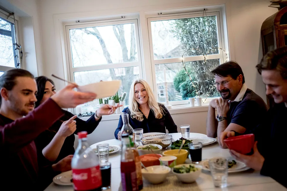 Lyse-direktør Toril Nag og ektemannen hennes Kjetil Flesjå i Incus Investor er opptatt av at barna tar høyere utdannelse. Her har de samlet deler av familien til middag i Sandnes. Far Kjetil Flesjå og sønn Håvard H. Flesjå (13) sitter til høyre, mens datteren Katrine Nag Vatne (24) og samboeren hennes Kjell Vistnes Randeberg (23), sitter til venstre. Foto: Tommy Ellingsen