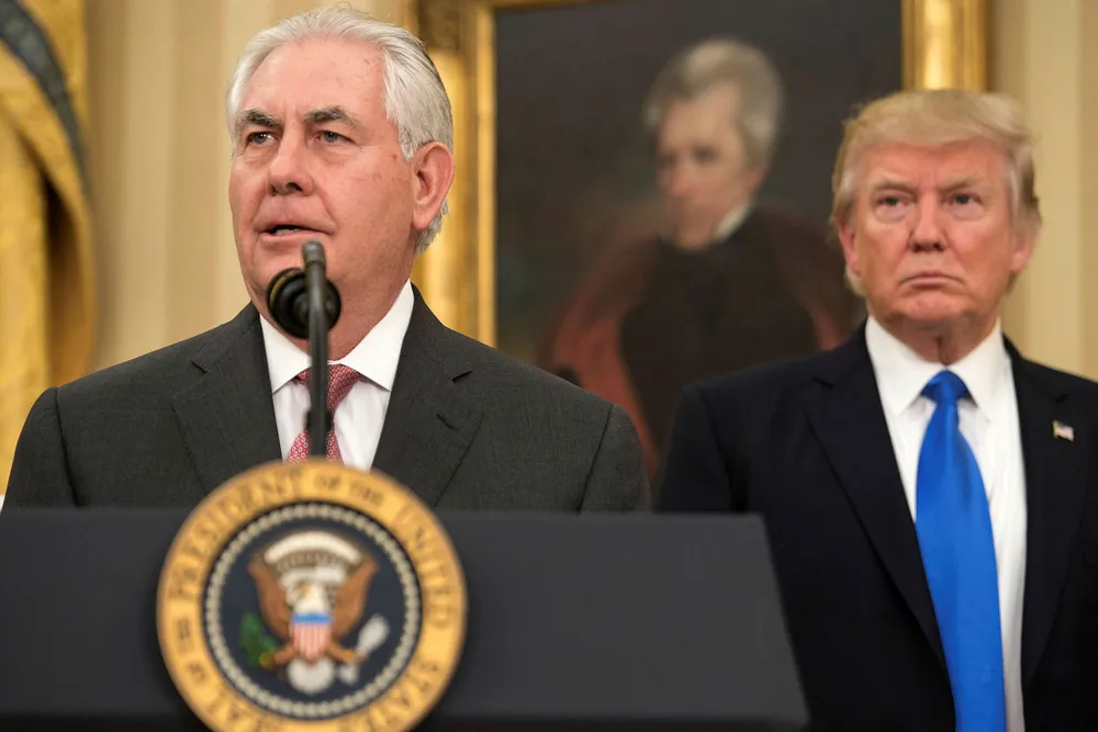 USAs president Donald Trump (til høyre) tok til Twitter i en opphetet ordkrig med tidligere utenriksminister Rex Tillerson. Her er de avbildet etter sistnevntes utnevnelse i februar 2017.