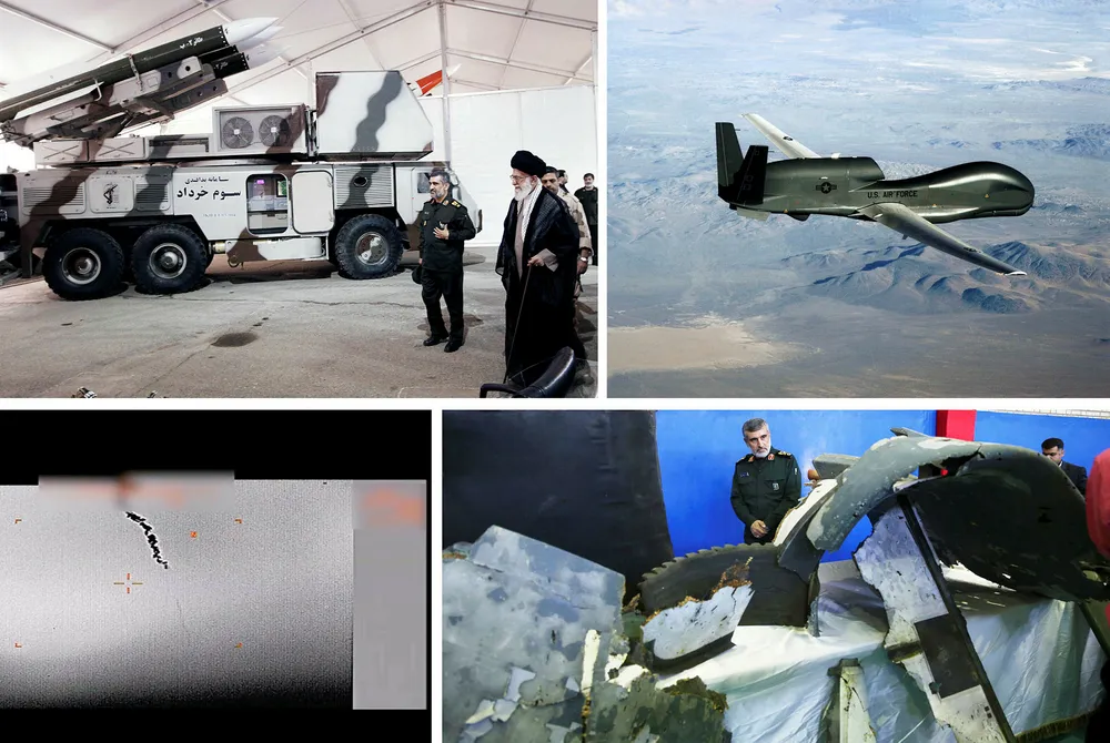 Øverst til høyre: Her inspiserer Irans øverste leder Ayatollah Ali Khamenei luftvernsystemet Khordad, som Revolusjonsgarden brukte til å skyte ned den amerikanske dronen. Til venstre er general Amir Ali Hajizadeh, kommandør i Revolusjonsgarden. Øverst til venstre: Overvåkningsdronen RQ-4 Global Hawk. Nederst til høyre: Radarbilde fra nedskytingen som USA påstår skjedde i internasjonal luftrom. Nederst til høyre: Iran påstår dette er vrakrester av dronen som Iran har hentet opp fra sjøen i iransk farvann.
